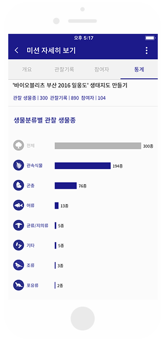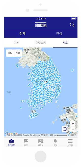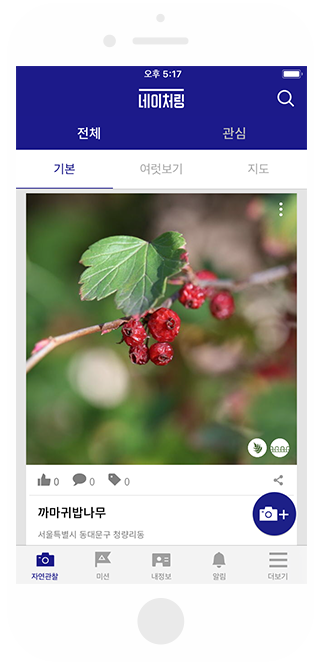 네이처링 모바일 앱 내가 만나는 자연을 언제 어디서나 기록하고 저장하세요.내 위치는 물론 주변관찰, 지난 기록,다른 사람들의 기록 등을 그때그때 확인하고지도로도 볼 수 있으며, 모르는 생물의 이름은그 자리에서 묻고, 답할 수 있습니다. 자연관찰 기록하고 싶은 자연을 만났을 때네이처링 앱을 열어촬영하고 기록하고 저장하세요. 미션 동네에서 지구까지,재미있는 제안에서 연구 프로젝트까지,미션을 만들고 참여하세요. 정보공유 대한민국 공식 생물 정보와전국 자연관찰자들이 보내온 오늘의 자연을함께 만나보세요. DownloadNATURING Mobile App 함께하는 사람이 많아질수록,시간이 지날수록 점점 더 풍부해질네이처링의 자연관찰자가 되어주세요.