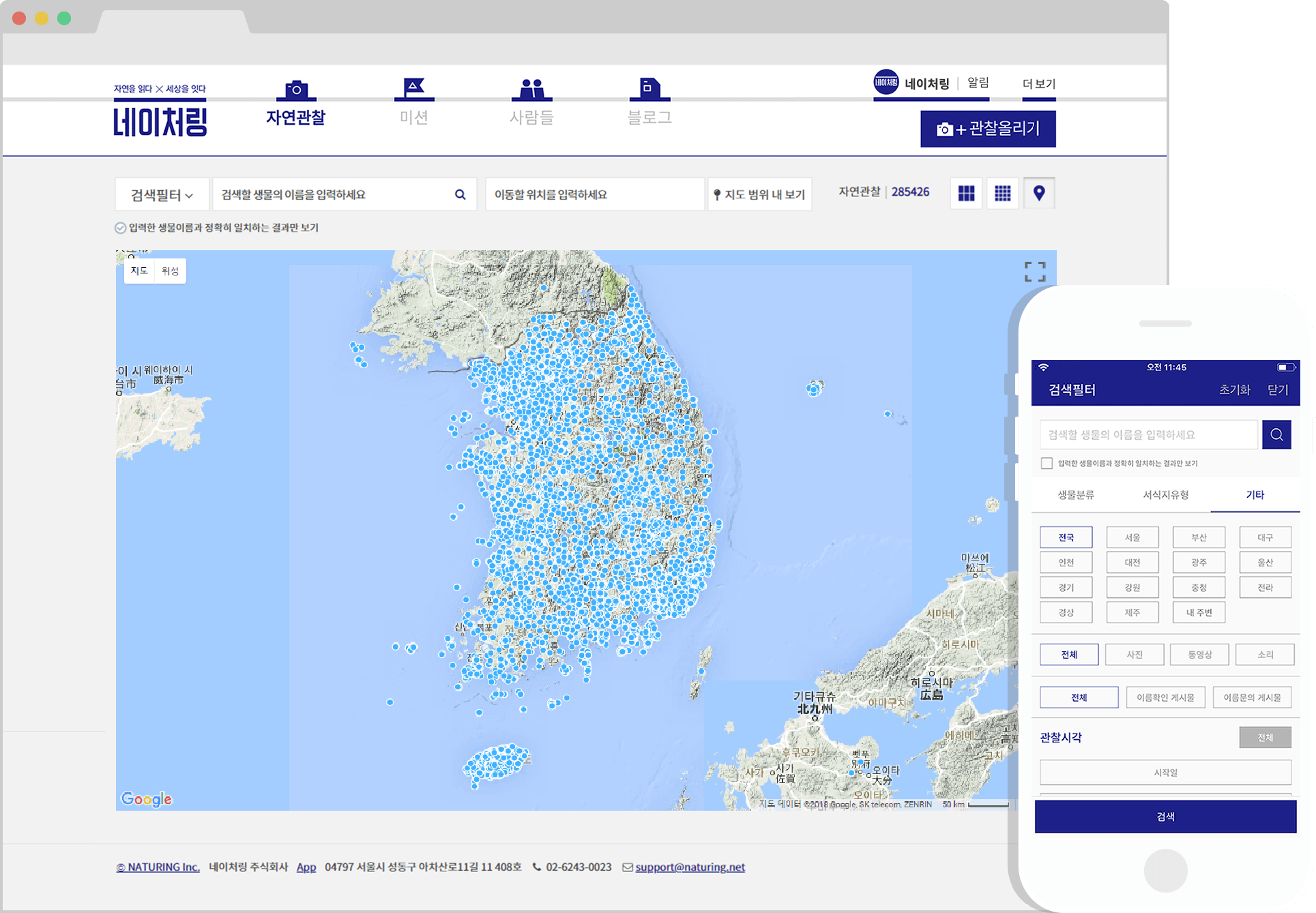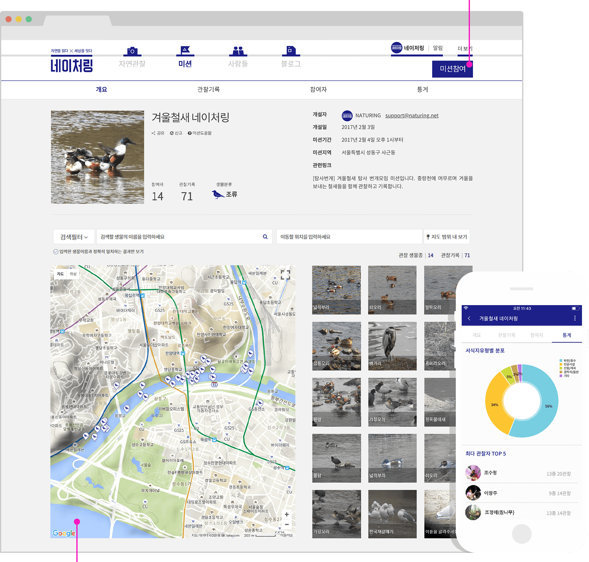 생태지도 작성네이처링에 기록된 자연관찰은 그 결과인 생태정보를 입체적이고 통합적으로 담는 지도 위에 표시됩니다. 위치정보가 포함된 자연관찰은 생물의 위치와 분포를 표시하는 시각적 자료로서 실시간 지도로 제공됩니다. 지도 위의 표시는 관찰 대상인 생물의 서식처이자 기록자의 관찰지입니다.