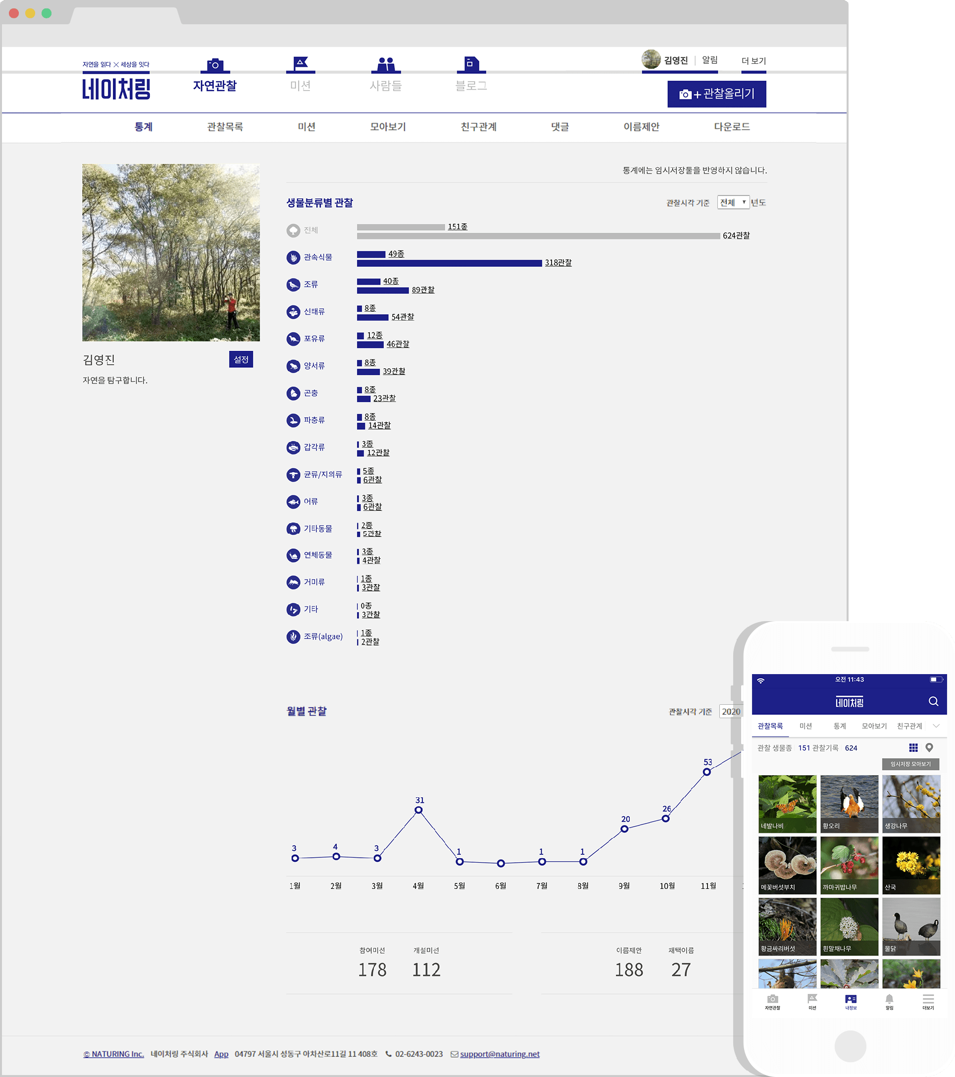 네이처링은 나의 자연관찰 기록을 다양한 방법으로 분류, 검색, 확인 및 관리할 수 있도록 편리한 기능들을 제공합니다. 마이페이지(내정보) 통계 메뉴의 그래프를 통해 생물분류별로 어떤 종을 얼마나 관찰하고 기록했는지, 연도별, 월별로 얼마나 많은 관찰을 기록했는지, 나의 기록 통계를 한눈에 볼 수 있습니다. 내가 기록한 모든 자연관찰을 생물분류별, 서식지유형별, 행정구역별, 관찰시각별, 게시시각별 등 다양한 기준의 분류로 따로 모아 볼 수 있고, 내가 만든 생태지도를 확인할 수 있습니다. 내가 모아보기한 자연관찰, 내가 만들거나 참여한 미션, 친구관계, 내가 쓴 댓글, 내가 한 이름제안 등 나의 모든 활동을 확인하고 관리할 수 있습니다.